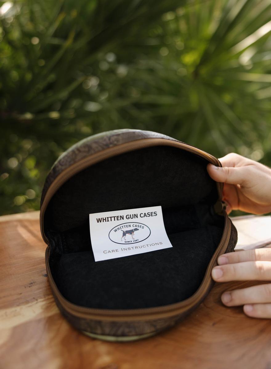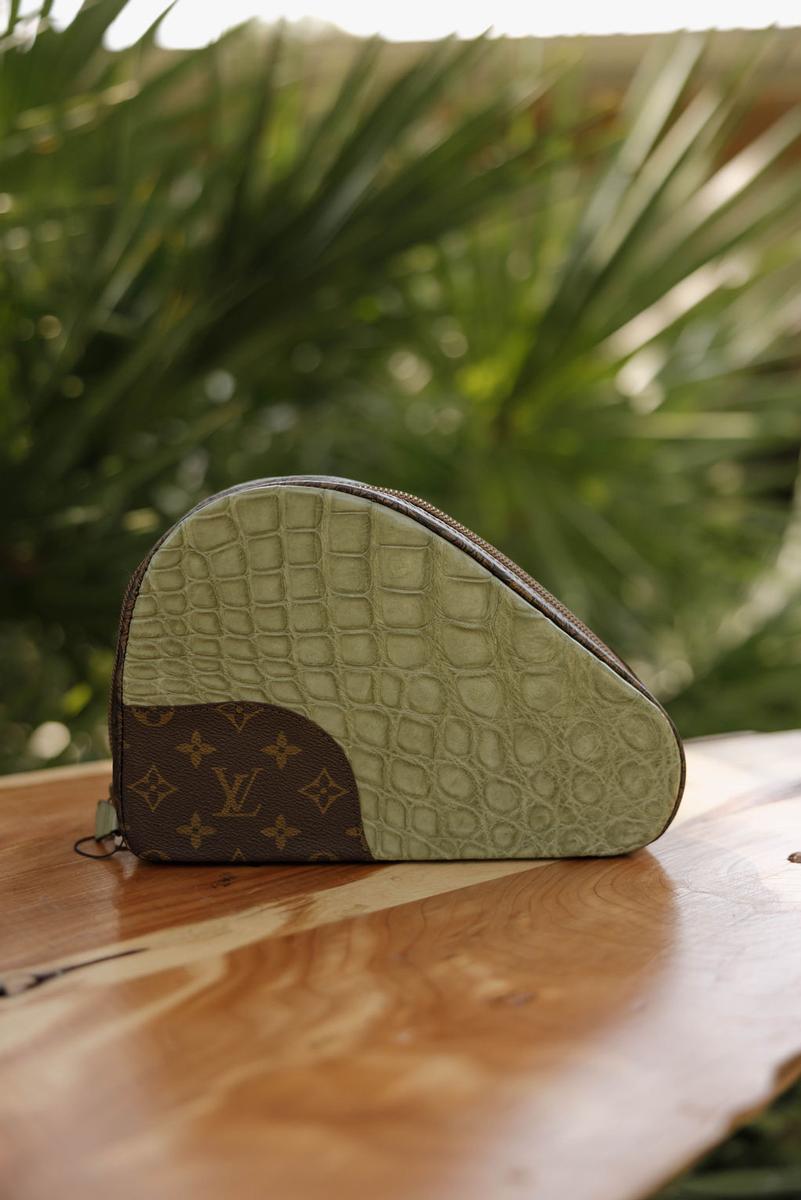 This sage green alligator, repurposed LV, and bronze paisley leather make the perfect trio for this classic pistol case. With a cushioned and lined interior, you can rest assured that your p-shooter will be secure and safe within this beauty. It fits medium sized pistols.