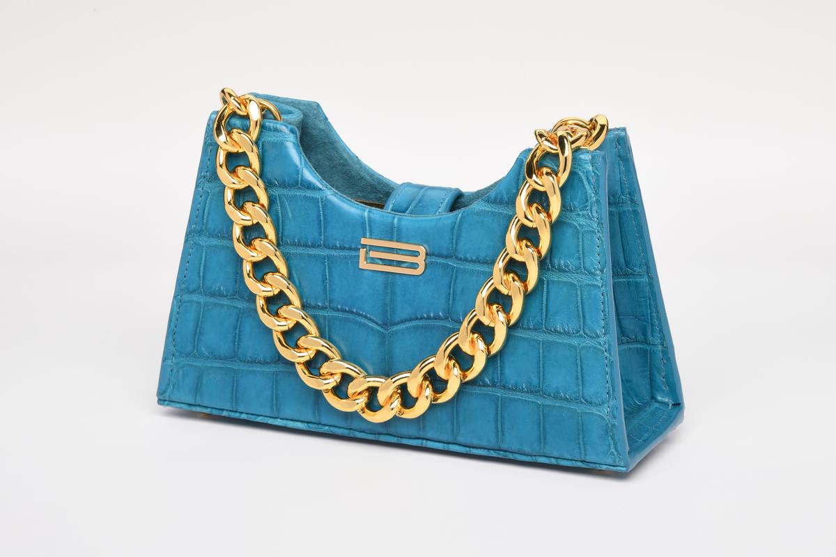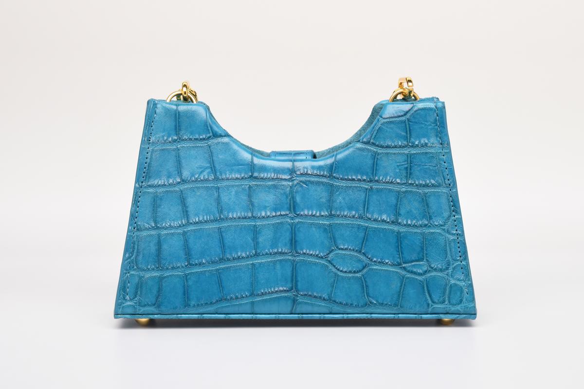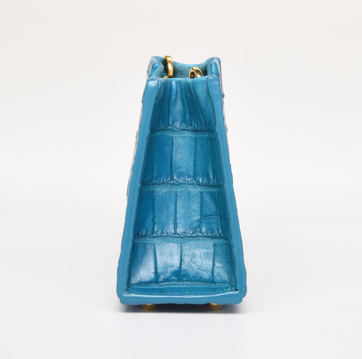 This stunning turquoise alligator purse was crafted by the renowned designer Gretchen Bauer with BSWANKY out of Sarasota Florida. All of its hardware is 24 karat gold and the purse has digital provenance with an individualized proof-it tag. This purse is one of a kind and there will not be another made in this alligator skin color. It is a fashionable must have.